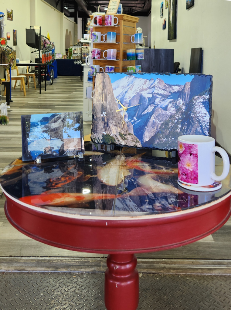 We are a Mom and Pop specialty print shop and photography gallery, showcasing photography printed on media other than paper. Slate is an excellent surface to present your photos as keepsakes; backlit glass is excellent for your landscape photos, giving the impression you are standing where you took the photo; and the aluminum we print on is ultra high definition – you’ll be able to count your cat’s whiskers. Glass cheese boards and charcuterie boards look so fabulous, you will leave them out on display. Custom aprons are a great way to highlight Dad’s prowess at the grill. We have our own photos printed on display and for sale as well. Customization is a snap with our upload site. Come in and see our shop to see what’s possible with your photos.