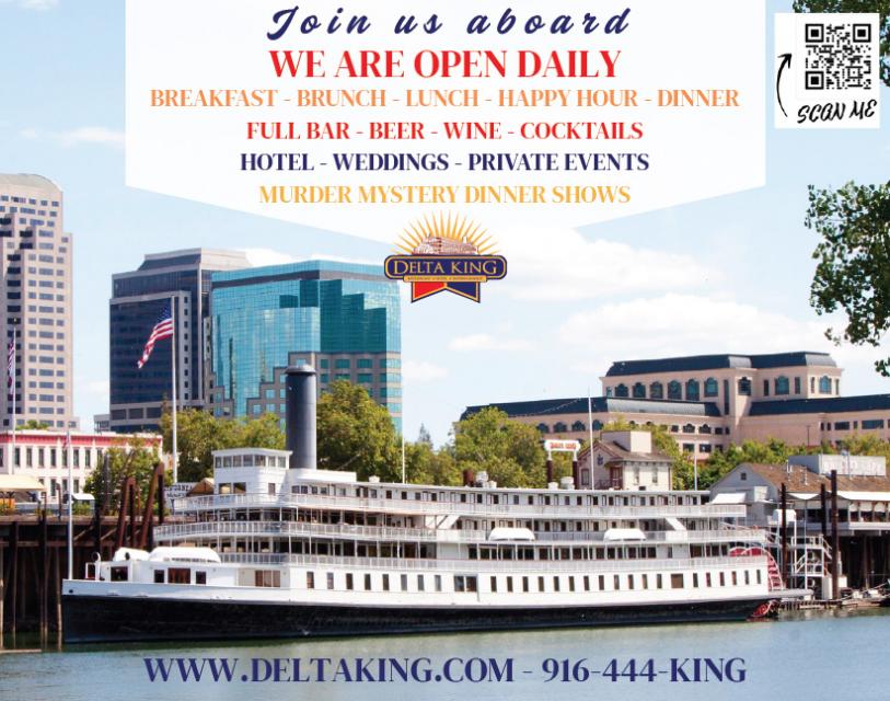 Welcome aboard our authentic paddlewheel riverboat, revived to its former glory and moored along the Old Sacramento Waterfront. Originally built in 1927, The Delta King has been restored and converted into a 44-room boutique hotel with one-of-a-kind facilities for riverfront dining, nightlife, weddings, conferences, and special events.