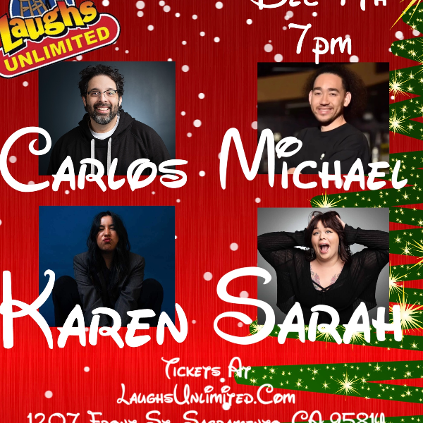 Folks with Jokes – Live Comedy Laughs Unlimited Event December 7, 2025 - 7:00pm - 8:30pm Laughs Unlimited Folks With Jokes Featuring: Carlos Rodriguez, Sarah Ellsworth, Michael Robinson, Karen Fergonzo Come get a jump start on your holiday cheer with laughter!!