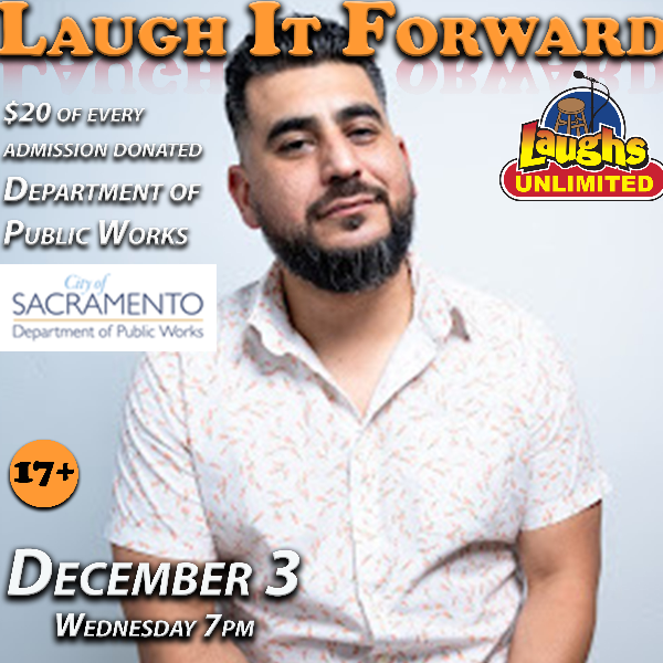 Laugh It Forward – Live Comedy laughs Unlimited Event December 3, 2025 - 7:00pm - 8:30pm Laughs Unlimited $20 of every admission goes to the Department of Public Works Headliner Rudy Ortiz