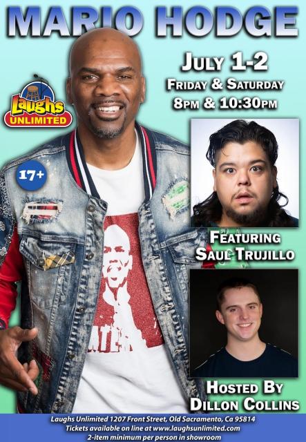 Mario Hodge Laughs Unlimited Comedy Club and Lounge Event July 1, 2022 - 8:00pm - 9:30pmJuly 1, 2022 - 10:30pm - 11:59pmJuly 2, 2022 - 8:00pm - 9:30pmJuly 2, 2022 - 10:30pm - 11:59pm Laughs Unlimited Featuring Saul Trujillo Hosted by Dillon Collins