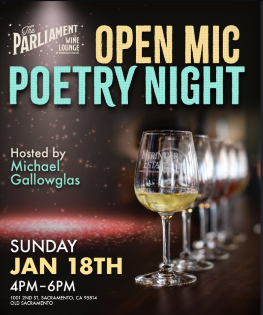 Open Mic Poetry Night The Parliament Wine Lounge Event January 18, 2026 - 4:00pm - 6:00pm The Parliament Wine Lounge Join us next Sunday for a special poetry night with the talented Michael Gallowglas! Sign-ups start at 3:30 PM Got a poem in a journal? Now’s your time to shine! See you in Old Sacramento!
