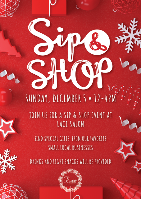 Sip n’ Shop Lace Salon Event December 5, 2021 - 12:00pm - 4:00pm Find special gifts for your loved ones while supporting some of our favorite small businesses! Drinks and light snacks will be provided. Sunday December 5th 12pm – 4pm