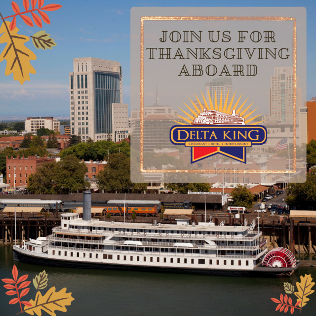 Celebrate Thanksgiving with family and friends aboard the historic Delta King. Enjoy a festive buffet featuring a chef’s carving station with roasted turkey and prime rib, traditional sides including mashed potatoes, stuffing, and gravy, and seasonal desserts highlighted by classic pumpkin pie. Experience timeless hospitality and riverfront views that make the holiday truly unforgettable.