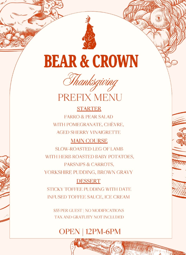 Thanksgiving Menu Bear & Crown Event November 27, 2025 - 12:00pm - 6:00pm Bear & Crown Join us this Thanksgiving from noon to 6 pm for a special prefix menu including slow-roasted leg of lamb with herb-roasted baby potatoes, parsnips & carrots, Yorkshire pudding, and brown gravy!