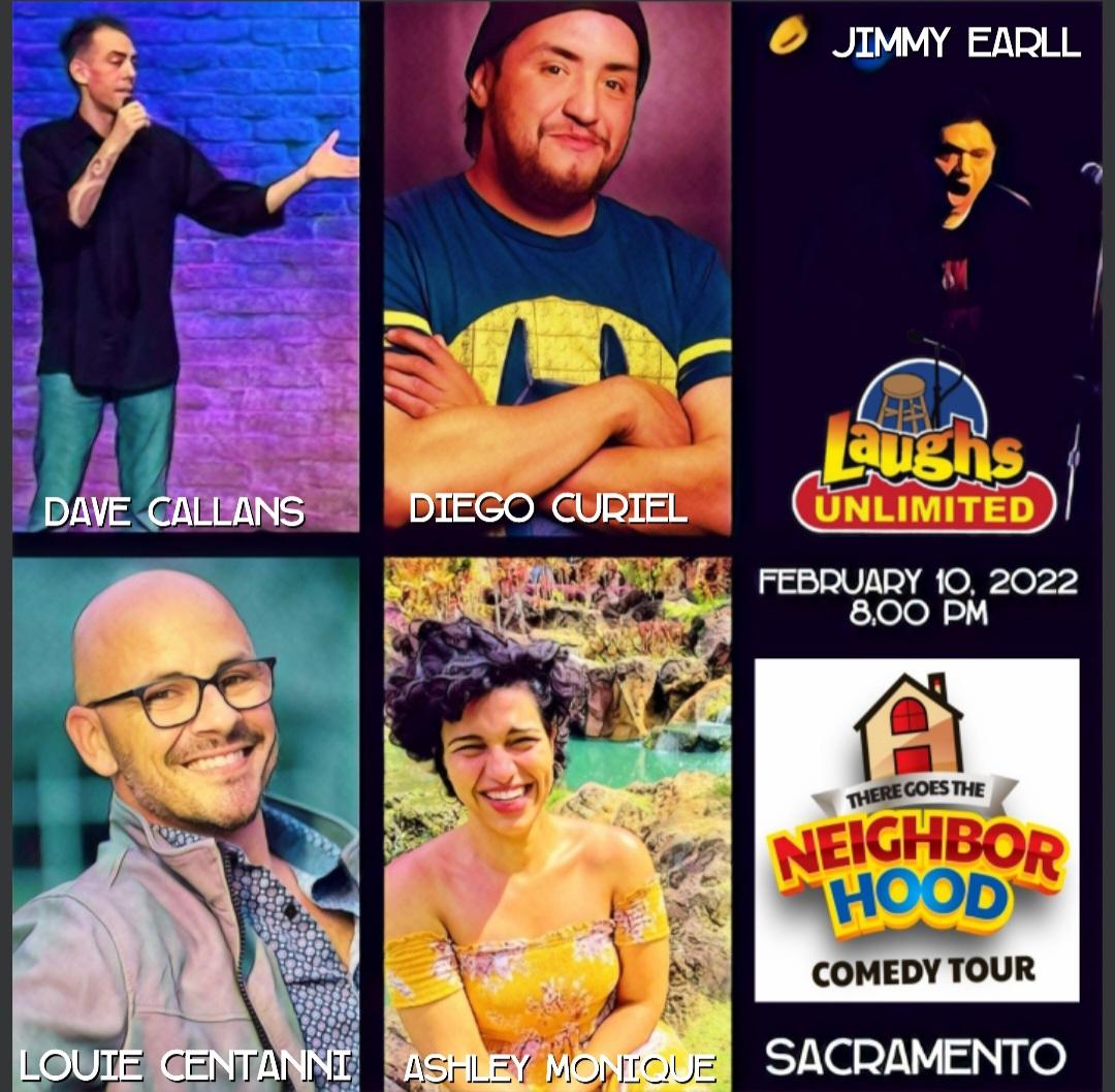 There Goes the Neighborhood Laughs Unlimited Event February 10, 2022 - 8:00pm - 9:30pm Laughs Unlimited February 10th 8:00 pm – 9:30 pm Featuring: Jimmy Earl, Dave Callans, Diego Curiel, Louie Centanni, and Ashley Monique