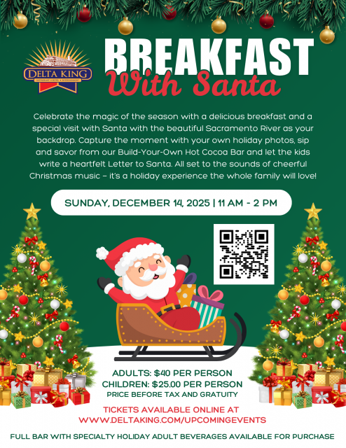 Celebrate the magic of the season with a delicious breakfast and a special visit with Santa with the beautiful Sacramento River as your backdrop. Capture the moment with your own holiday photos, sip and savor from our Build-Your-Own Hot Cocoa Bar and let the kids write a heartfelt Letter to Santa. All set to the sounds of cheerful Christmas music — it’s a holiday experience the whole family will love!