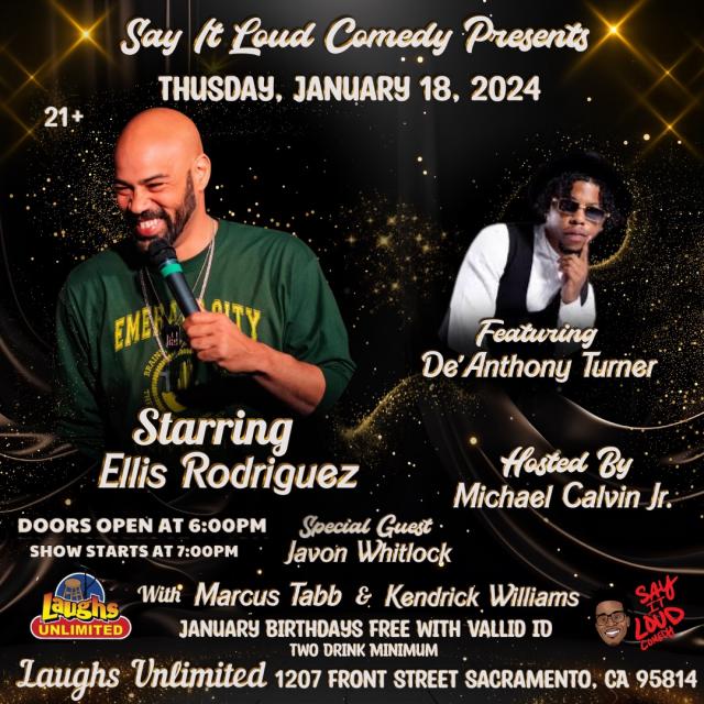 Say It Loud – LIVE COMEDY Laughs Unlimited Comedy Club & Lounge Post January 18, 2024 - 7:00pm - 8:30pm Starring Ellis Rodriguez Featuring De’Anthony Turner Hosted By Michael Calvin Jr Special Guest Javon Whitlock with Marcus Tabb & Kendrick Williams January Birthdays FREE with Valid ID